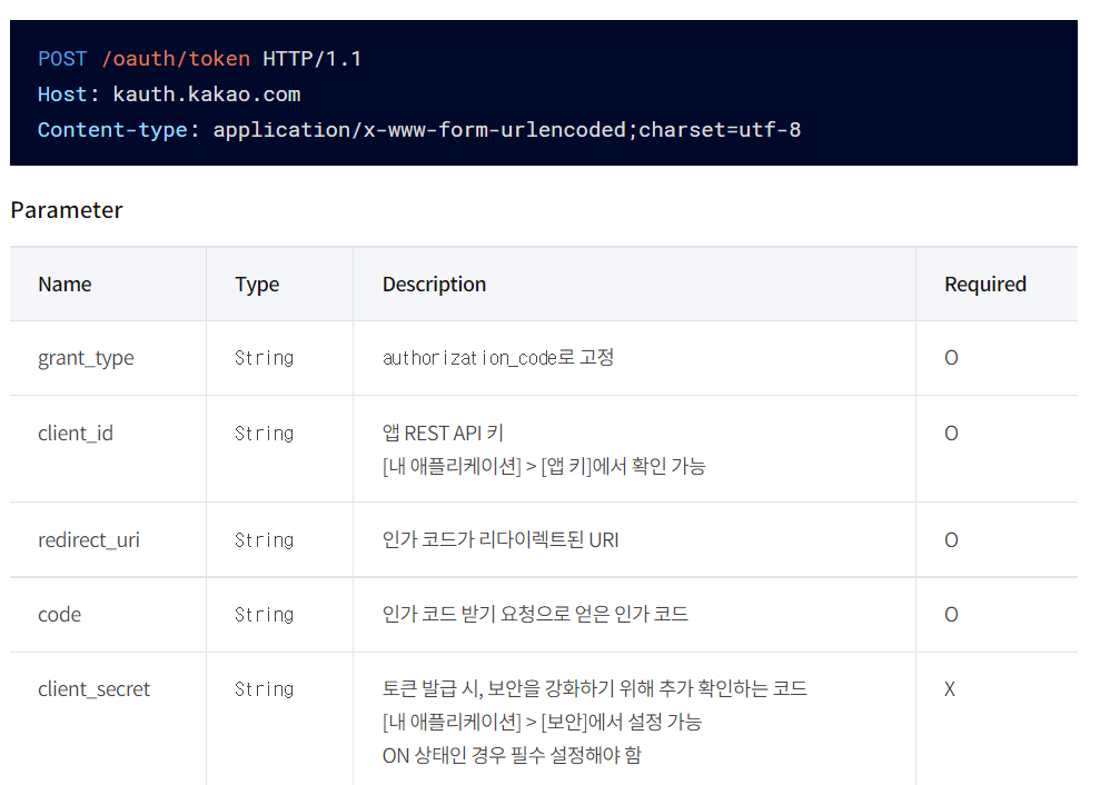 인가코드를 리턴하는 url이다. 파라미터로 rest api 키값과 리다이렉트 url을 주면 code값을 파라미터로 담아 리다이렉트되어 인가코드를 얻을 수 있다.