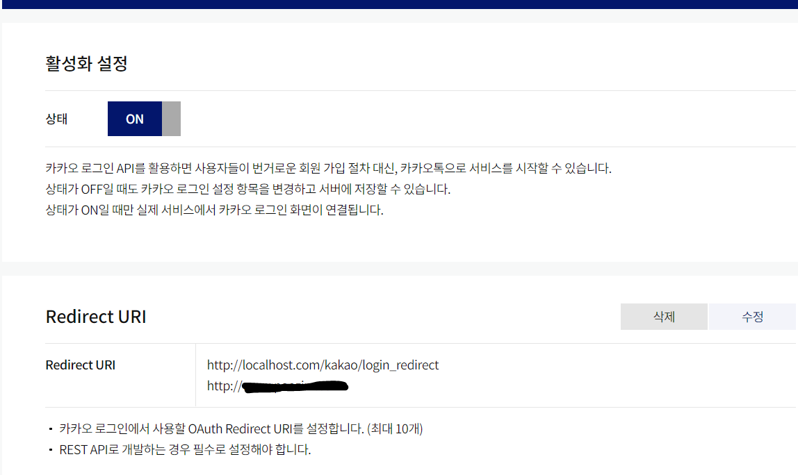카카오 로그인탭에 들어가 활성화를 시켜주고 Redirect URL에 localhost와 개인 사이트가 있다면 추가해준다.