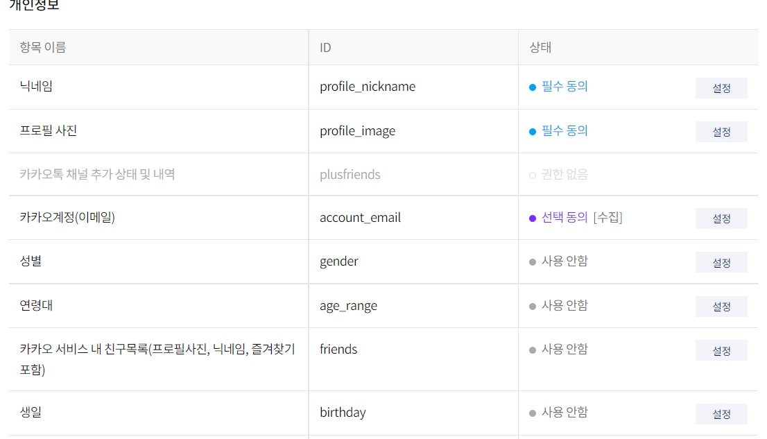 기본적으로 카카오 내 애플리케이션 > 카카오 로그인이 활성화 되어있어야하고 정보 받을 항목을 동의항목에서 설정해주어야 한다.