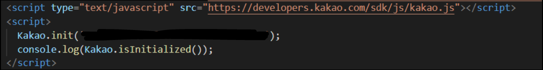 Kakao.init으로 초기화를 해줘야하는데 이때 값으로 javascript 키값을 넣어주어야한다.