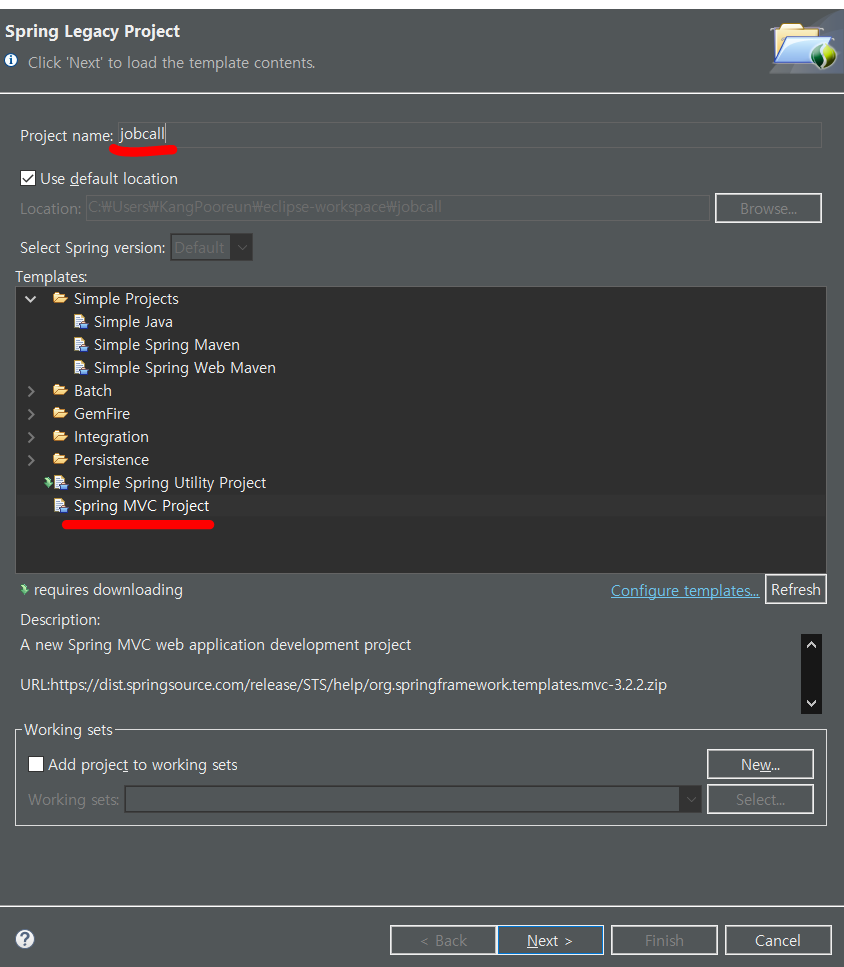 프로젝트명을 입력해주고 Spring MVC Project 선택 > Next 누르면