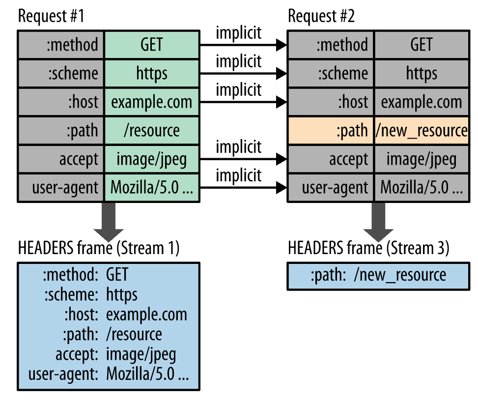 http 2.0에서는 이미 중복된 헤더에 대해서는 변화된 부분만 전송이 가능해져서 헤더의 크기를 상당히 줄일 수 있다.