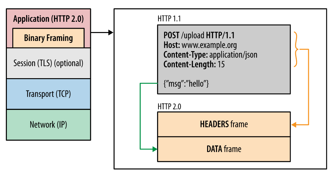 2.0에선 헤더와 데이터를 frame 단위로 나누고, 바이너리로 인코딩하여 다수의 프레임으로 구성된 메세지를 전달하는 방식이다.