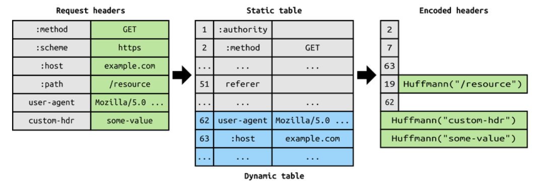 HPACK방식은, 헤더 정보를 Header Table로 관리하여 중복된 헤더는 인덱스 값만 전송하고, 새롭게 추가되거나 변경된 헤더는 Huffmann 인코딩이 되어 전송하는 방식을 말한다.