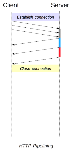 이전 요청에 대한 응답이 와야만 새로운 요청을 보냈던 동기적 방식에서 보완되어 하나의 커넥션에 이전 요청에 대한 응답을 기다리지 않고 순차적으로 여러 요청을 보내고, 그 순서에 맞춰 응답을 받아 지연시간을 줄이는 방식이다.