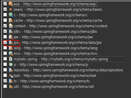 datasource-context.xml 내용이다. 먼저 Namespace에 JPA를 추가해주어야한다. 추가 안하면 <jpa>를 사용못해서 설정 할 수 없다.
