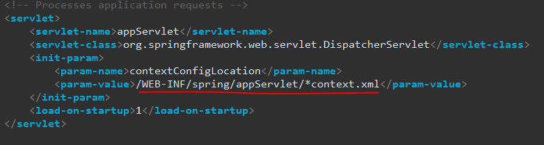 밑줄친 부분을 보면 appServlet 디렉토리에 context.xml로 끝나는 파일은 모두 적용시키고 있다.