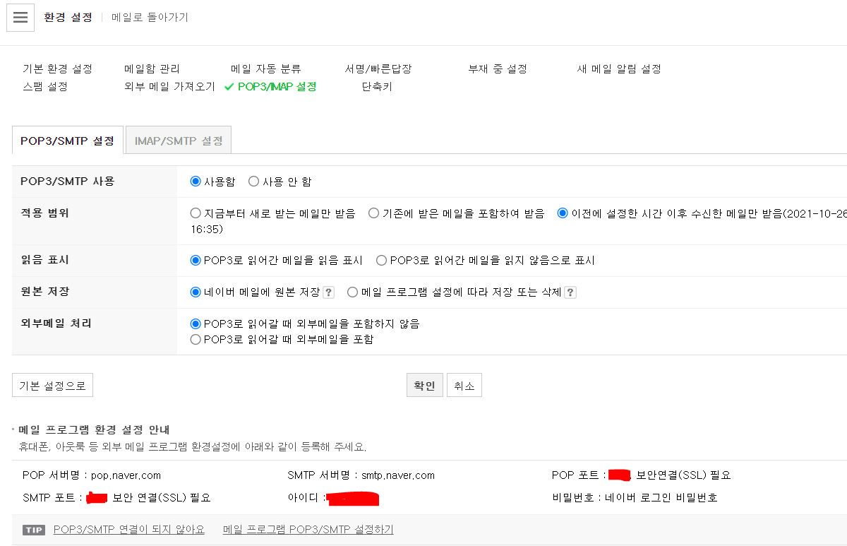 네이버 메일 > 환경설정(아래에 조그맣게 있음) > POP3/SMTP 설정 > 사용함 설정
