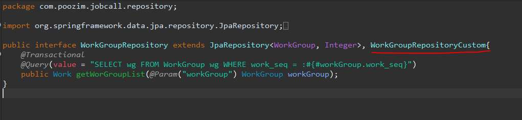 기존에 존재했던 WorkGroupRepository에 추가로 WorkGroupRepositoryCustom과 WorkGroupRepositoryCustomImpl을 생성했다.