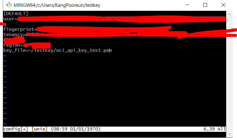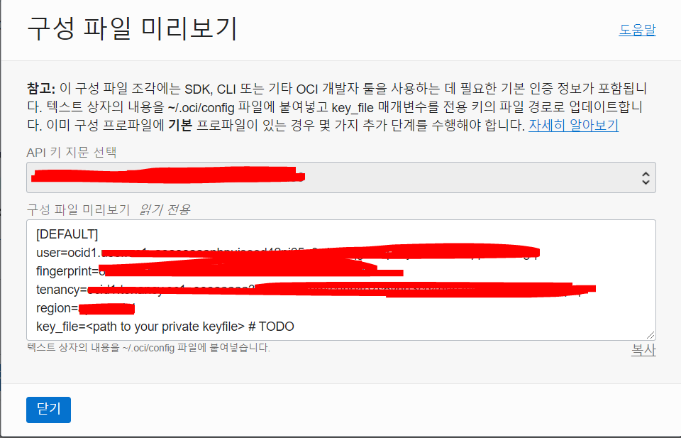 이렇게 oci에 필요한 설정값들 정보가 나온다. 참고로 구성파일은 config 파일을 말한다. 구성파일 미리보기의 복사를 눌러서 복사한 후, 터미널에서 생성한 키가 있는 디렉토리에 config 파일을 추가해야한다.