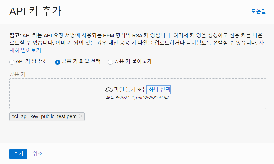 이제 오라클 클라우드 계정 페이지에서 api 키를 업로드 해줘야한다.