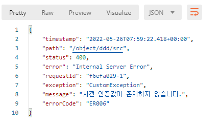 CustomException은 따로 구현한 Exception들 이라고 생각하고, 그 커스텀으로 생성한 Exception 클래스가 발생한 경우 원하는 데이터를 추가하거나 덮어쓰는 로직이다. 이는 결과 부분을 보면 더 이해가 수월하다.